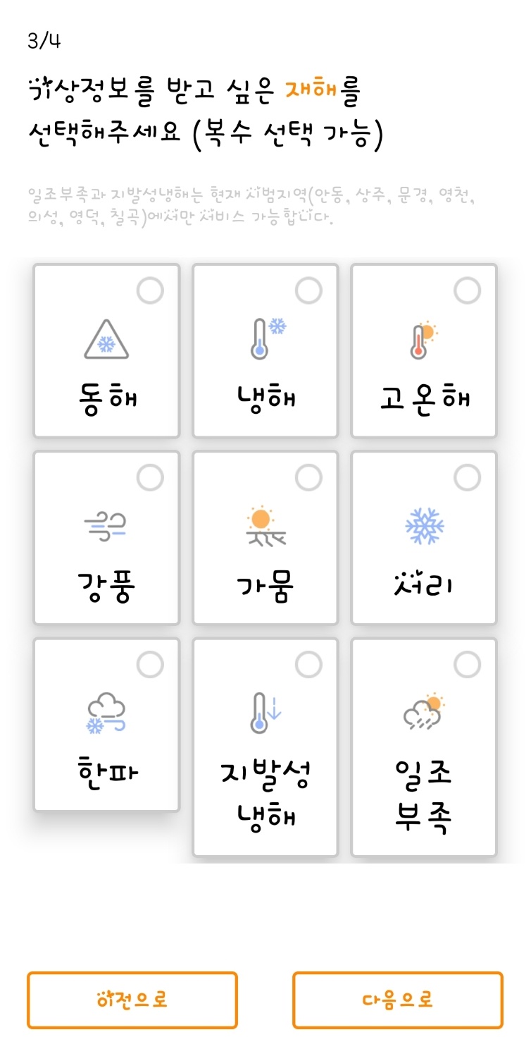 키우고 계신 농작물 선택 -> 자연재해 선택 -> 등록된 주소지의 구체적인 날씨 확인 가능