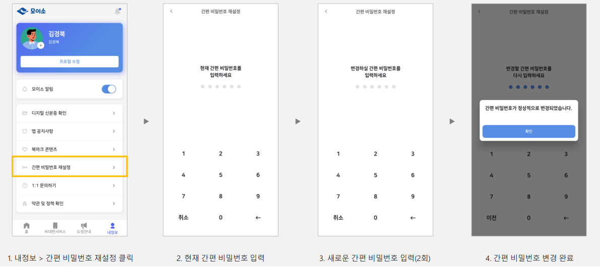 A : "모이소" 앱의 내 정보에서 간편 비밀번호 재설정을 클릭하고 비밀번호를 변경하시면 됩니다.
