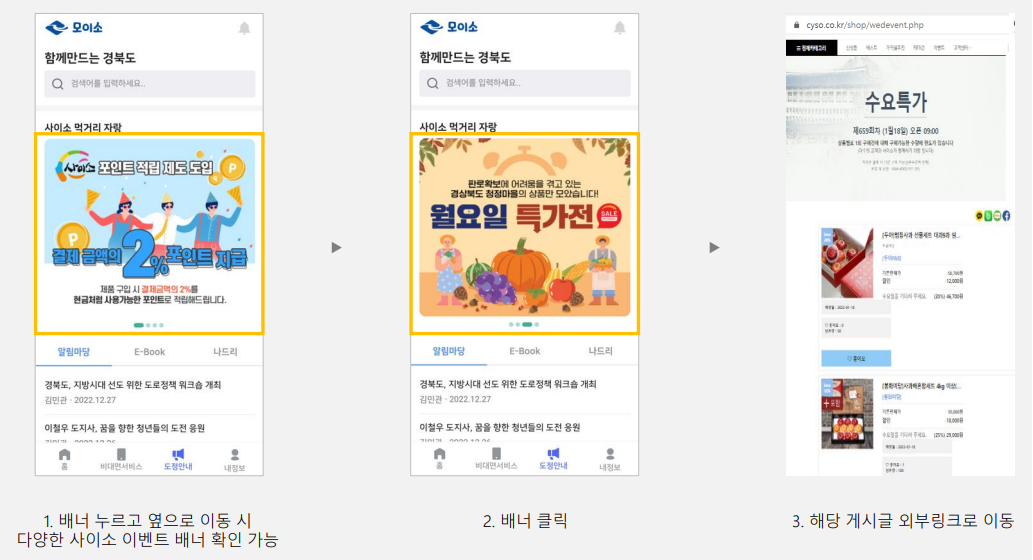 "모이소" 앱은 도민들을 위한 다양한 혜택을 제공합니다. 지역 농산물 할인권, 관광지 할인 등 다양한 혜택을 통해 경상북도 생활을 더욱 풍요롭게 만들 수 있습니다.