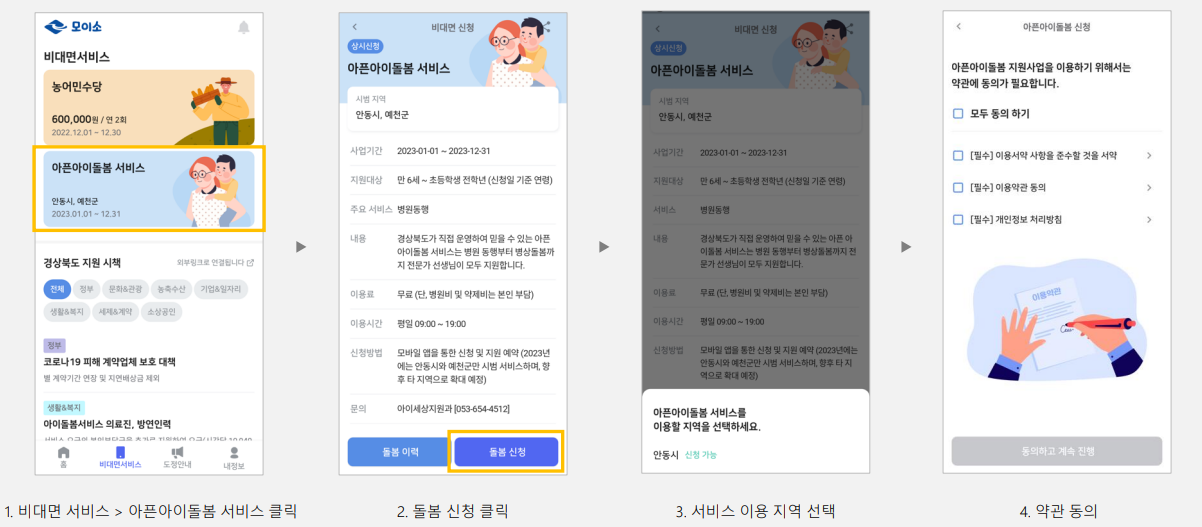 "모이소" 앱을 통해 다양한 행정 서비스를 비대면으로 신청하고 이용할 수 있습니다. 농어민 수당 신청, 아픈 아이 돌봄 서비스 신청 등 다양한 서비스를 간편하게 이용할 수 있습니다. 특히, 이번에 새로 개시하는 임업인 원클릭 서비스(상주시), 시·군 교복지원 서비스(봉화군)는 도민들의 편의를 더욱 높여줄 것으로 기대됩니다.
