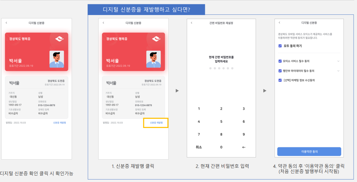 A : "모이소" 앱에서 디지털 신분증 확인 클릭 시 확인이 가능하시며 재발행을 하고 싶으시다면 디지털 신분증의 맨 아래에 보면 신분증 재발행을 통해 변경 가능합니다.
