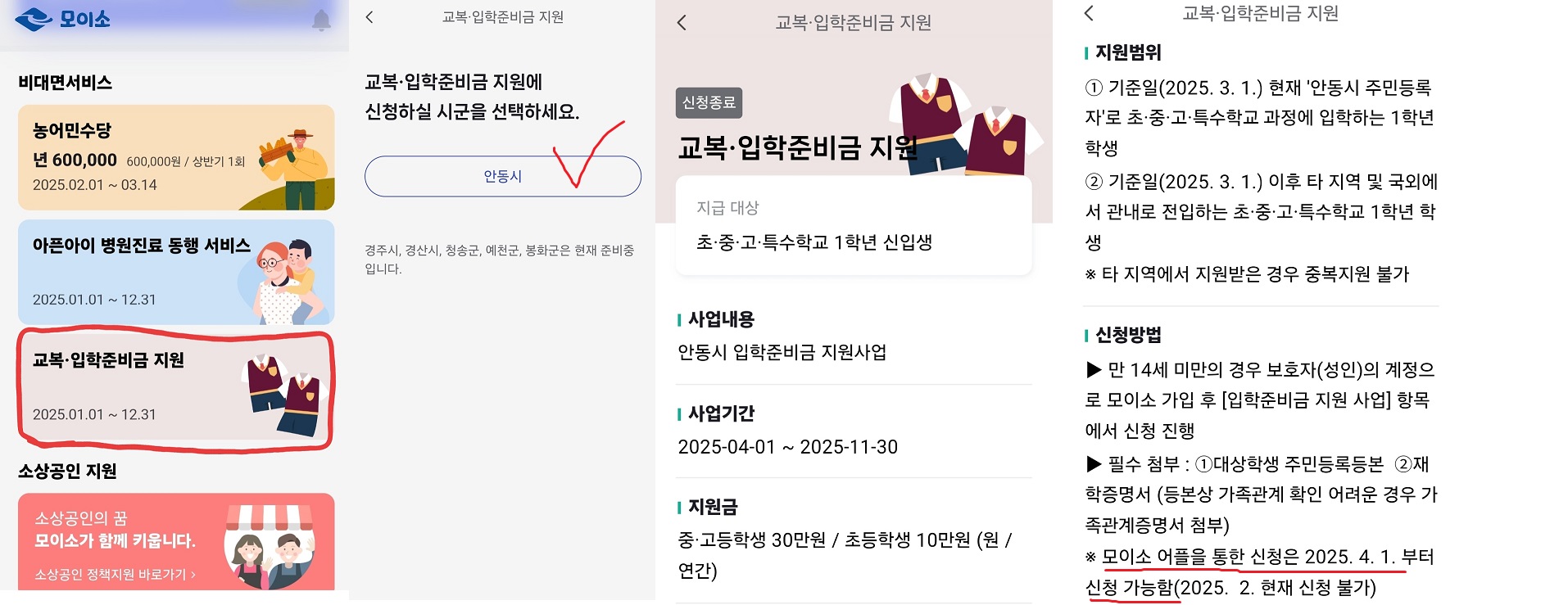 4. 교복&입학준비금 지원 : 현재는 안동시만 진행 중이며 어플을 통한 신청은 2025년 4월 1일부터 가능합니다.