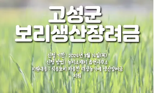 고성군에서 농한기 농가의 소득을 높이기 위해 '보리 생산장려금' 지원 신청접수가 시작되었습니다. 이번에 시작된 '보리 생산 장려금'은 농한기 농가들을 지원하기 위한 것입니다. 그렇다면 신청조건과 대상, 신청방법에 대해서 자세히 알아보겠습니다.