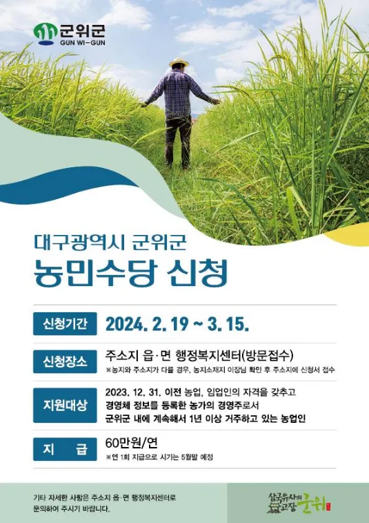 - 지원대상 : 2023년 12월 31일 기준으로 군위군 내에 주소를 두고 있으며, 농업 및 임업에 종사하는 농가의 경영주