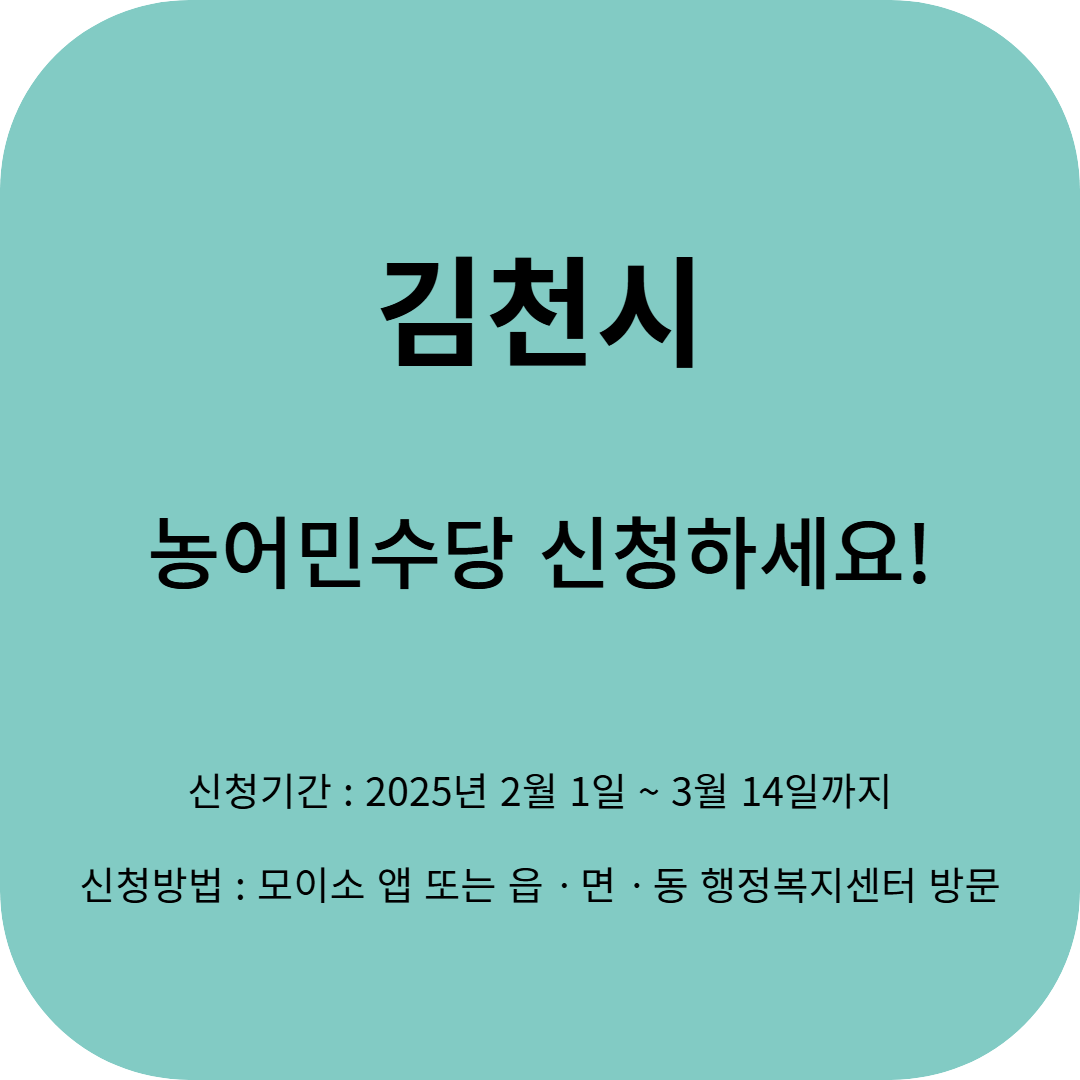김천시에서는 지난 2월 1일부터 3월 14일까지 농어업인을 대상으로 하는 2025년 농어민수당 신청 기간이 시작되었습니다. 이번 글에서는 신청에 필요한 정보와 절차, 혜택 등을 자세히 알아보도록 하겠습니다. 김천시에서는 농업인들의 안정된 경영과 생계를 도모하기 위해 이러한 제도를 시행하고 있으니, 꼭 참고하시기 바랍니다.