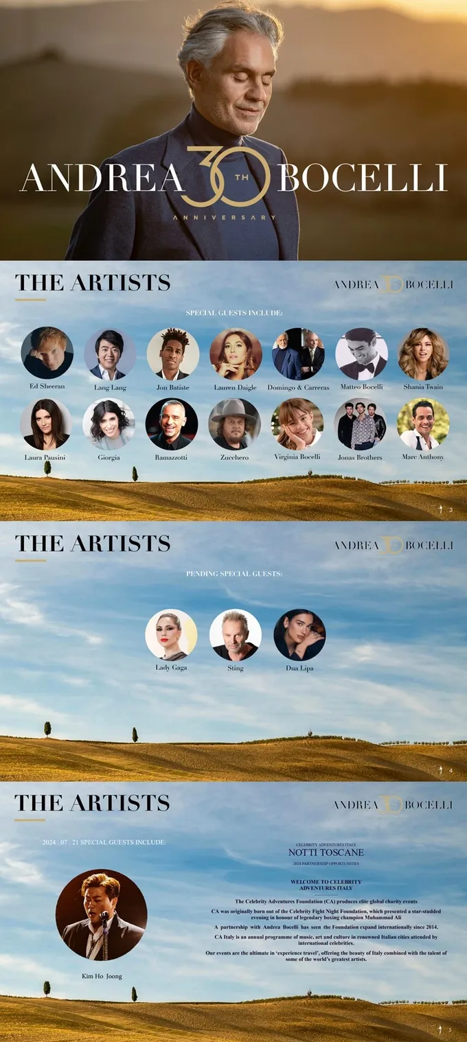 '트바로티'라는 별명으로 불리는 김호중은 오는 7월 21일 이탈리아에서 개최되는 안드레아 보첼리 30주년 기념 콘서트에 참여합니다. 에드 시런, 레이디 가가, 스팅, 두아 리파 등 팝스타는 물론 플라시도 도밍고, 호세 카레라스 등 성악가, 피아니스트 랑랑 등 세계적인 스타들이 함께하는 무대에서 김호중은 한국 대표 아티스트로서 자신의 존재감을 드러낼 예정입니다.