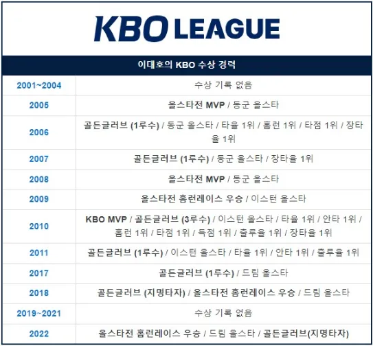 이대호는 한국 야구의 역사에 길이 남을 선수 중 한명입니다. 그의 야구선수로서의 활약은 KBO 리그에서의 트리플 크라운, 메이저리그에서의 활약, 국제대회에서의 우수한 성적 등 다양한 기록을 세웠습니다.