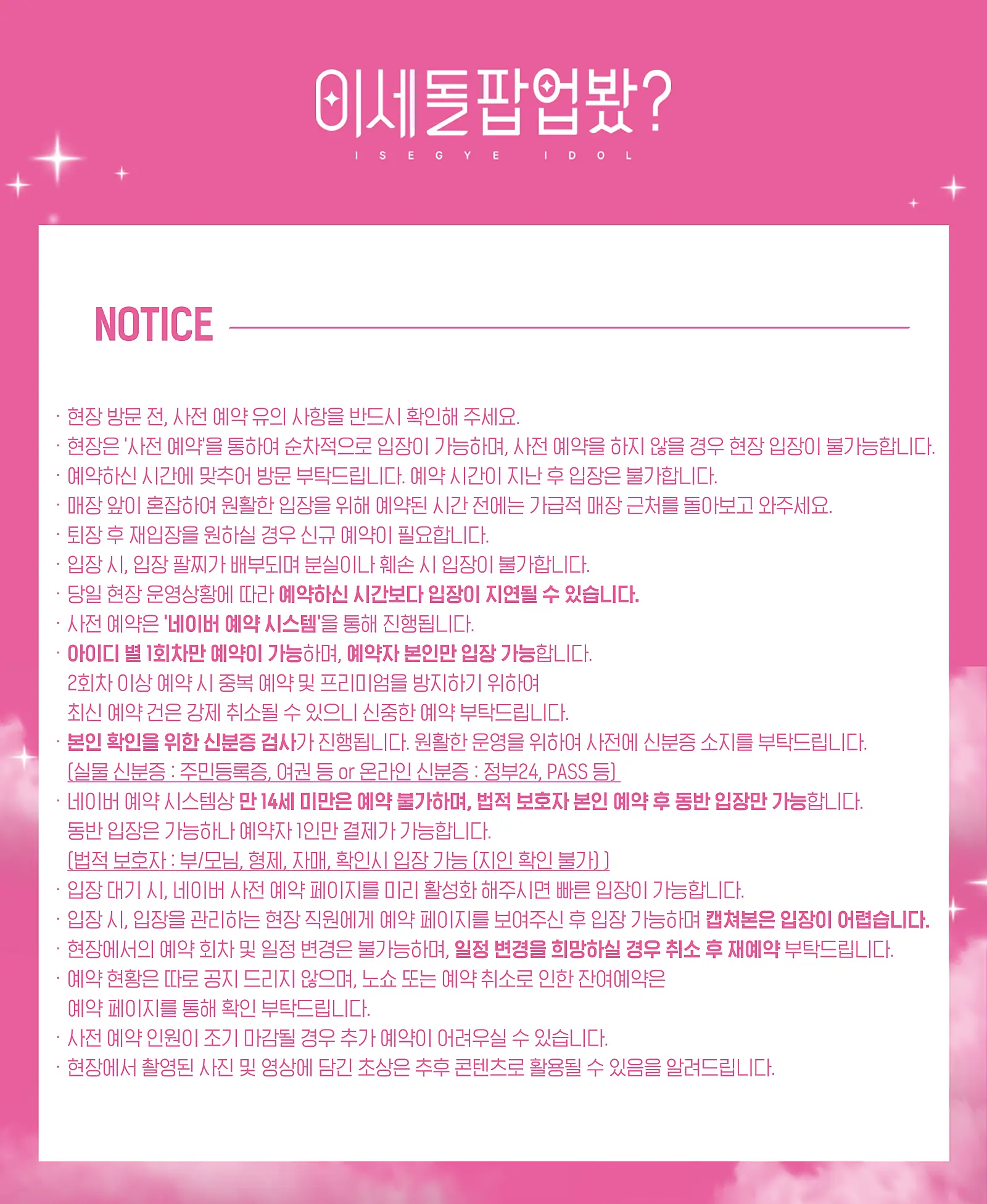 이벤트는 2주 동안 진행되며, 팬들은 이 기간 동안 멤버들의 다양한 굿즈를 구매할 수 있을 것입니다. 사전 예약은 네이버 예약 시스템을 통해 이루어지며(현재는 준비가 되지 않아 X의 위드뮤 공지사항 참고해주세요) , 주의사항에는 아이디별 1회 차만 예약 가능하며, 동반 입장은 법적 보호자만 가능하다는 점이 안내되어 있습니다.
