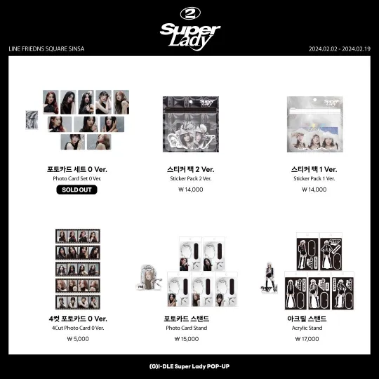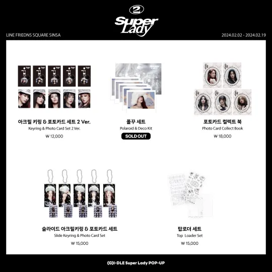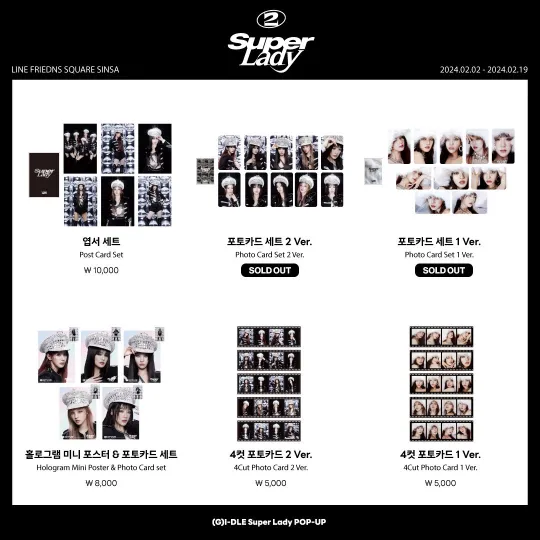 "라인프렌즈 스퀘어 신사에서 열리는 (여자)아이들 'Super Lady' 앨범 팝업은 멤버들의 강인한 매력이 돋보이는 특별한 공간으로 변신했습니다. 의상 전시, 멤버들의 포스터, 다양한 굿즈 등을 통해 팬들은 음악뿐만 아니라 패션과 아트의 매력을 만끽할 수 있습니다. 글로벌한 인기를 증명한 (여자)아이들과의 소중한 만남을 기대해 보세요."