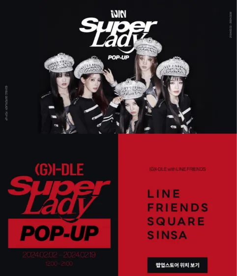 라인프렌즈 스퀘어 신사는 (여자)아이들의 'Super Lady' 앨범 컨셉에 맞게 특별히 재단장되었습니다. 멤버들의 강인한 아름다움이 돋보이는 색채와 디자인으로 가득한 이 공간은 팬들에게 더욱 특별한 경험을 안겨줄 것입니다.
