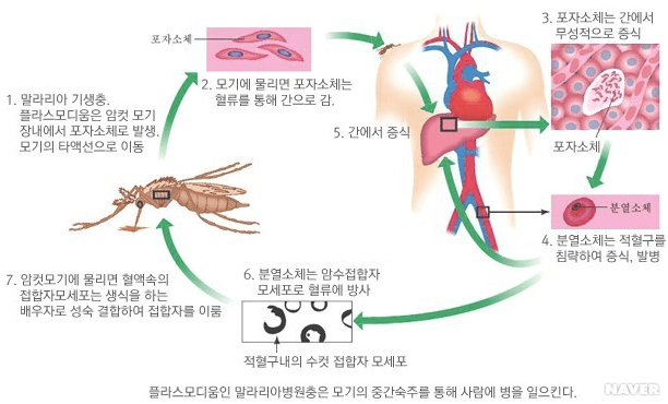 말라리아에 감염된 모기에게 물리면, 모기의 침 속에 있던 플라스모디움 기생충이 사람의 혈액 속으로 들어갑니다. 플라스모디움 기생충은 간에서 증식한 후 적혈구를 파괴하면서 발열, 오한, 두통 등의 증상을 일으킵니다.