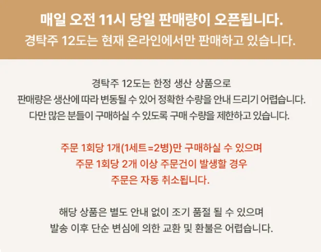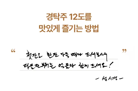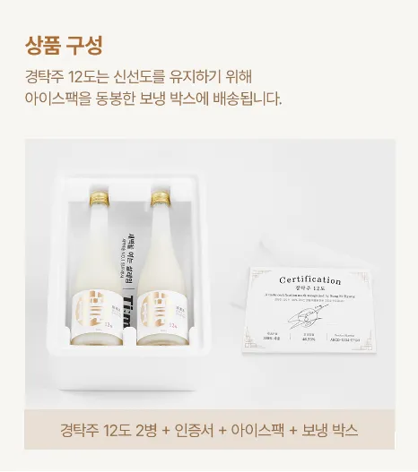 '경탁주'는 12도의 탁주로, 전통 막걸리 제조법에 현대적인 기술을 접목하여 만들어졌습니다. 100% 국내산 쌀과 곡물을 사용하고, 6개월 이상 숙성하여 깊은 맛과 풍미를 자랑합니다. 또한, 화려한 디자인의 병과 박스는 '경탁주'를 단순한 술이 아닌 선물용으로도 인기 있게 만들고 있습니다.