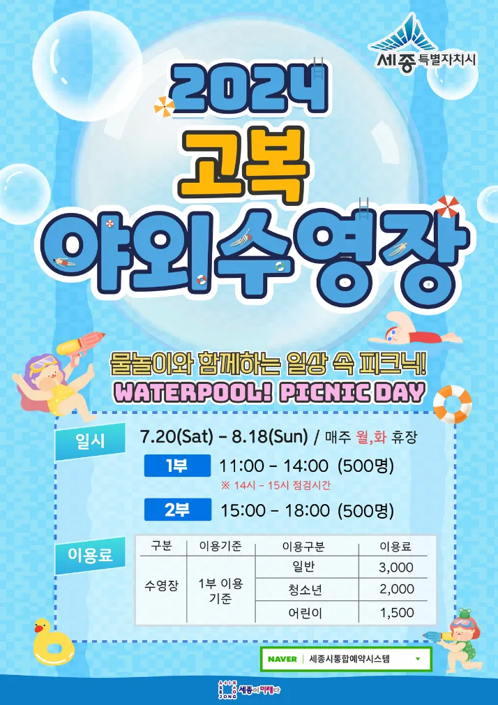 2024년 여름, 세종 고복저수지 야외수영장에서 더위를 식히고 즐거운 시간을 보내세요! 넓은 수영장, 다양한 수영 레저 시설, 그리고 시원한 물놀이가 여러분을 기다립니다. 가족, 친구, 연인과 함께 방문하여 잊지 못할 추억을 만들어보세요!
