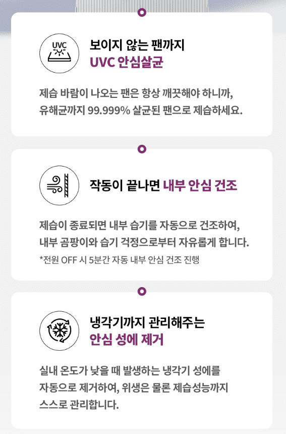 - "UV 살균 기능이 있어서 공기를 깨끗하게 유지할 수 있어 좋아요. 가족들의 건강을 생각하니 가치가 있는 기능입니다."