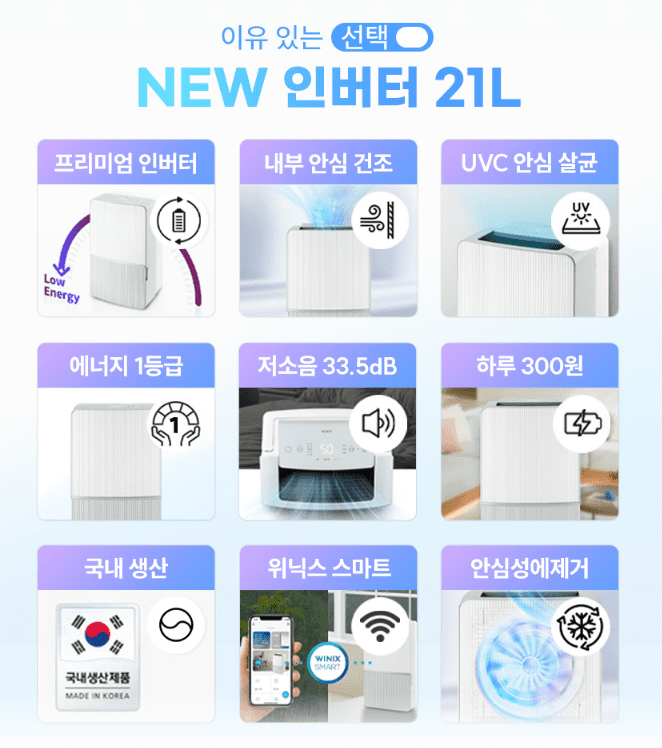 | 제습능력 | 1일 최대 21L (30℃, 60% 상대 습도 기준) | 강력한 제습 성능 (1일 21L) | |