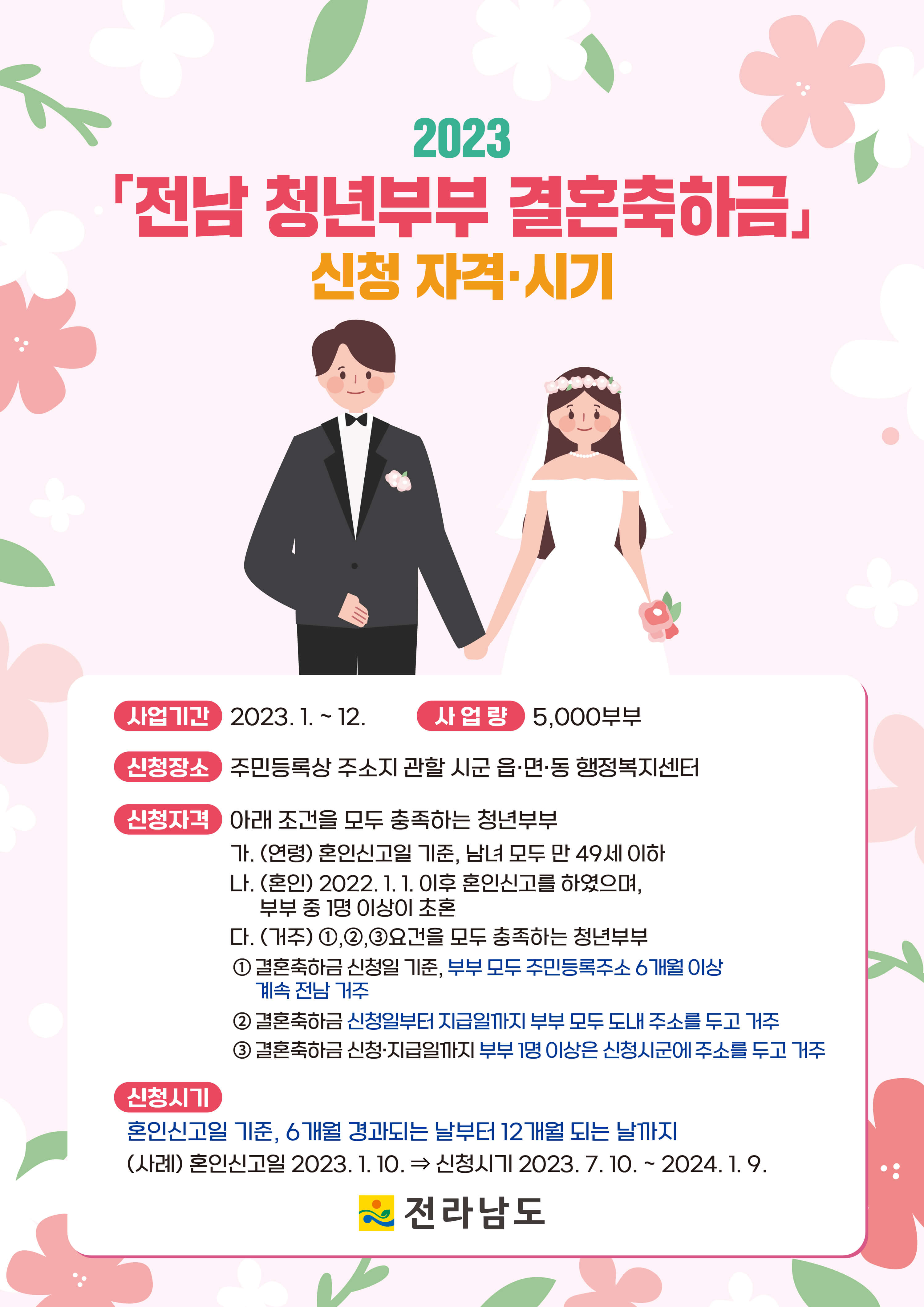 나이 제한: 49세 이하의 남녀 혼인 일자: 2022년 1월 1일 이후 혼인한 부부 중 초혼자 거주 조건: 결혼축하금 신청 시점부터 6개월 동안 전라남도에 거주 중인 부부.