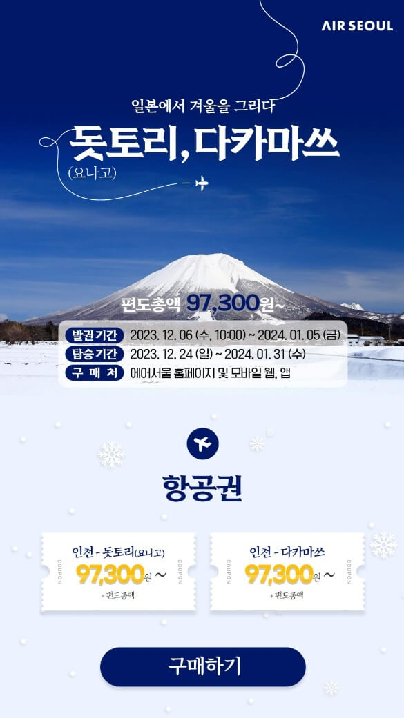에어서울은 다카마쓰 노선에 대한 프로모션을 실시합니다. 발권기간은 2024년 1월 5일까지이며 항공권을 특별 가격으로 판매합니다. 2024년 1월 31일까지의 탑승 기간 중 이 특별한 혜택을 누릴 수 있습니다.