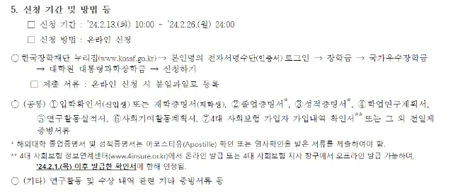 2024년 대학원 대통령과학장학금의 신청 기간은 2월 13일부터 26일까지이며, 온라인을 통한 신청이 가능합니다. 신청자는 국내 이공계 대학원 학과에 입학 예정 또는 재학 중인 대한민국 국적 소지자여야 합니다.