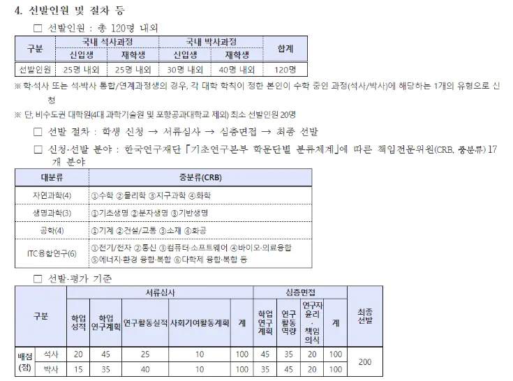| 선발인원 | 25명 내외 | 25명 내외 | 30명 내외 | 40명 내외 | 120명 |