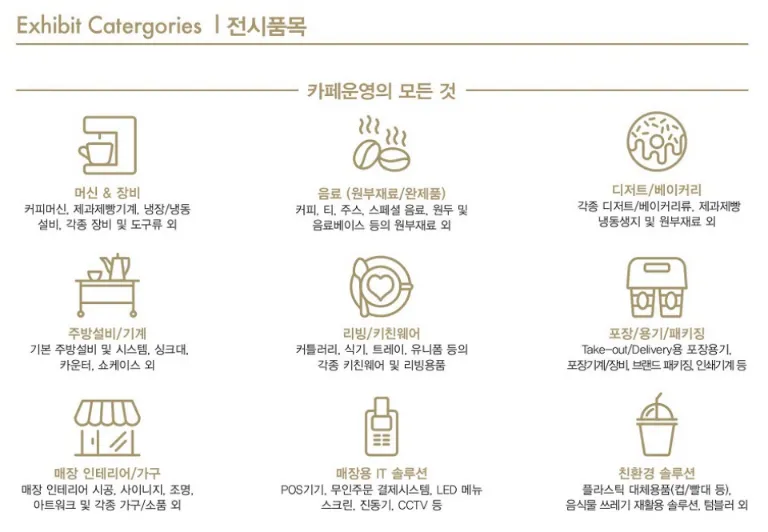 - 머신&장비, 원두, 음료(원부재료/완재품), 디저트, 베이커리, 주방설비/기계, 리빙/키친웨어, 포장/용기/패키징, 매장인테리어/ 가구, 매장용 IT 솔루션, 친환경 솔루션
