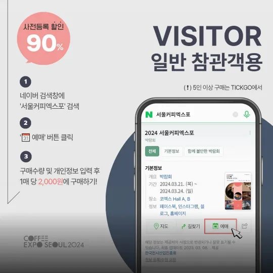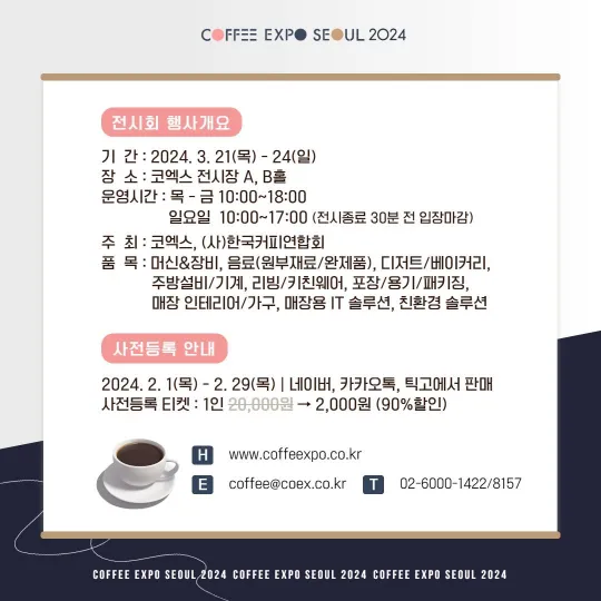 커피를 좋아하시는 여러분들에게 반가운 소식이 전해졌습니다. 2024년 서울커피엑스포가 다가오고 있습니다. 이번 행사에 사전등록하면 정가 대비 90%의 할인혜택을 받을 수 있으니 놓치지 마세요!