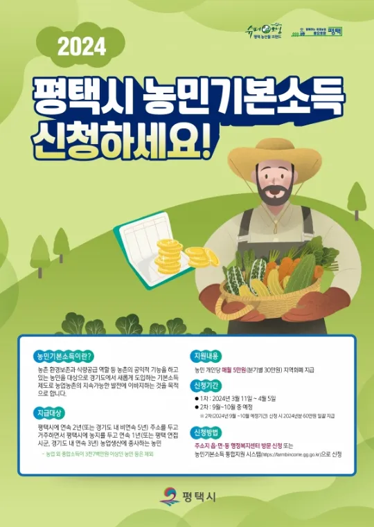 2024년 평택시 농민 기본소득 신청이 시작되었습니다! 농민 기본권 보장 및 농업의 공익적 가치에 대한 보상을 목적으로 하는 이 사업은 농업 생산에 종사하는 농민에게 최대 60만 원까지 지원합니다.