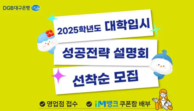 DGB대구은행이 내년 대학입시를 대비하여 고등학생 및 학부모를 위한 '2025학년도 대학입시 성공 전략 설명회'를 개최합니다. 이번 행사는 11월 14일에 칠성동 제2본점에서 열리며, 송원학원 차상로 진학실장과 국어 강사 류서희 강사, 수학 강사 이성재를 초청하여 진행될 예정입니다.
