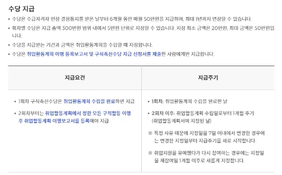 구직촉진수당은 수급자격자 인정 결정통지를 받은 날부터 6개월 동안 매월 50만원을 지급하며, 최대 1년까지 연장 가능합니다. 회차별 수당은 300만원 범위 내에서 5만원 단위로 조절될 수 있습니다. 수당을 받기 위해서는 취업활동계획 이행 등록보고서 및 구직촉진수당 지급 신청서를 제출해야 합니다.