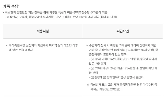 또한, 최근 가족 수당에도 새로운 변화가 있습니다. 생활안정 기능을 강화하기 위해 가구원 특성에 따라 구직촉진수당 추가급여가 이뤄지고 있습니다. 미성년자, 고령자, 중증장애인 부양가족 1인당 10만원의 추가 지급이 이루어지며, 최대 40만원까지 받을 수 있습니다.