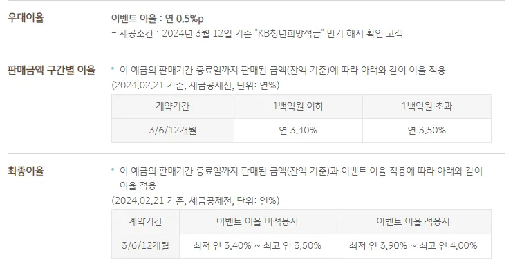 - 우대금리 조건 : 'KB청년희망저금' 만기 고객만 4.5% 우대금리 적용