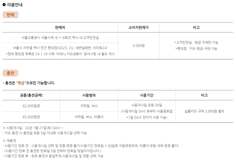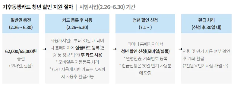 | 이용 방식 | 2월 26일 ~ 6월 30일(기존카드 이용 후 7월 환급 신청, 7월부터 할인 가격으로 직접 충전) |